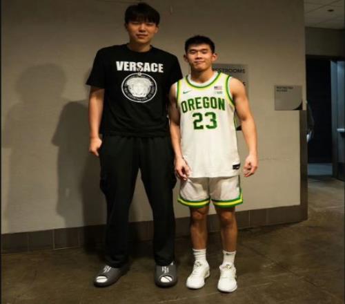 杨瀚森来到了现场观战,为俄勒冈大学出战的老乡林葳助威。