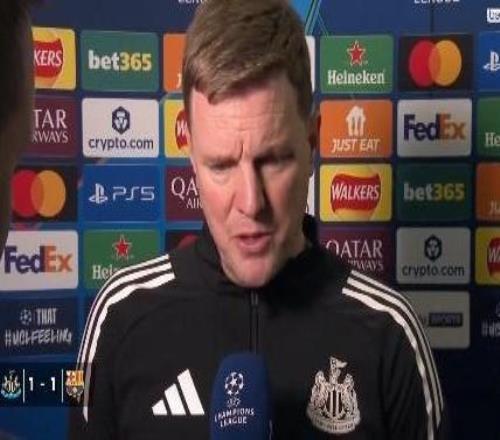 欧冠1/8决赛首回合,纽卡主场1-1战平巴萨,纽卡主帅埃迪-豪赛后接受了拜因体育的采访。我不知道该祝贺你们打出...